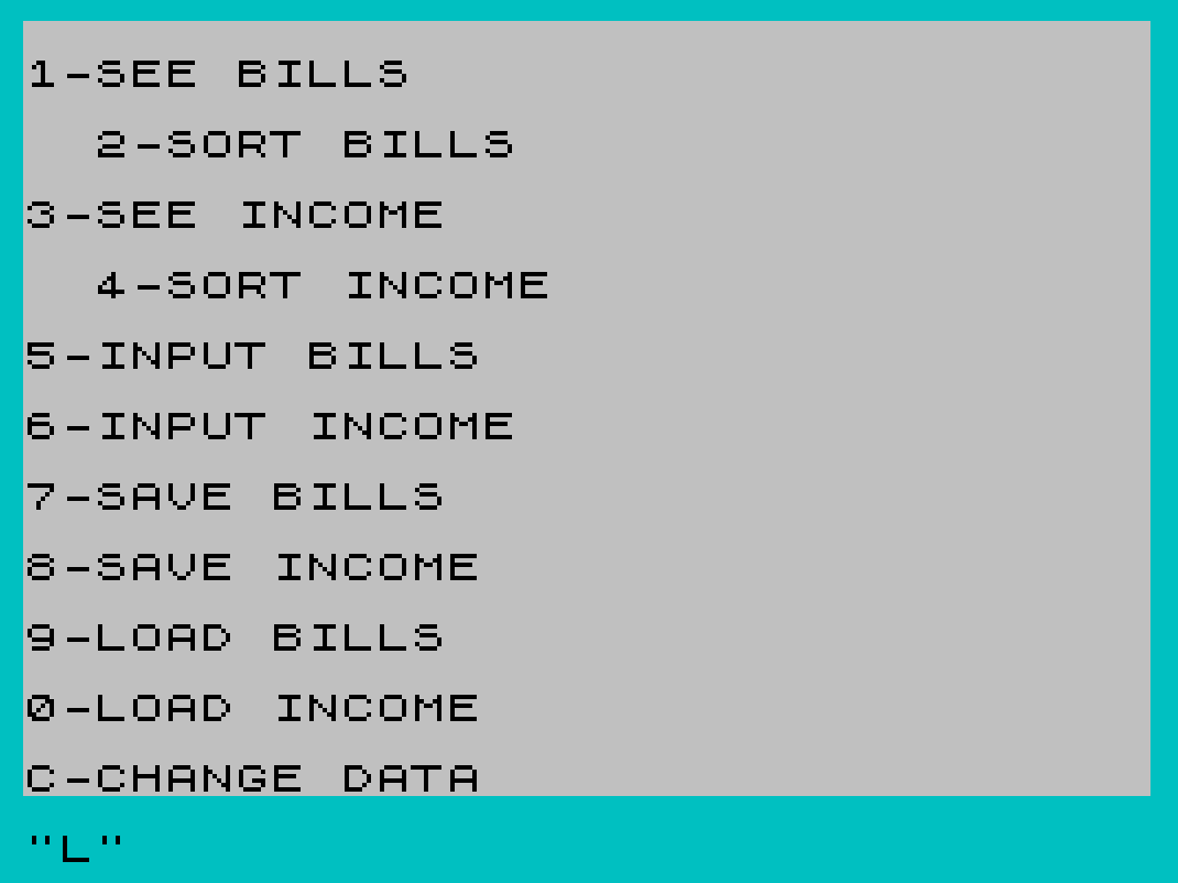 3610 PRINT "Do You Want To Change The": PRINT "Bills Or Income ? (B or I)": PRINT