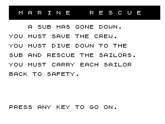 3050 PRINT AT 4,4;"A SUB HAS GONE DOWN.";AT 6,0;"YOU MUST SAVE THE CREW.";AT 8,0;"YOU MUST DIVE DOWN TO THE";AT 10,0;"SUB AND RESCUE THE SAILORS."