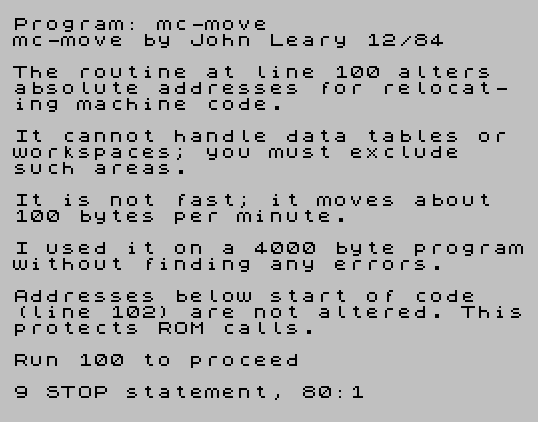 10 PRINT "The routine at line 100 alters absolute addresses for relocat- ing machine code."
