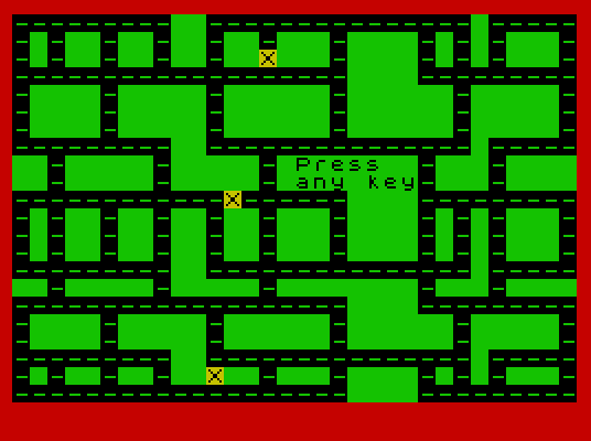 170 PRINT AT 8,16; INVERSE 1;"Press";AT 9,16;"any key": INK 0: PAPER 6: FOR n=1 TO 3: PRINT AT w(1,n),w(2,n);"X": NEXT n