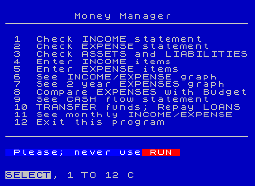 6080 PRINT " 5 Enter EXPENSE items"," 6 See INCOME/EXPENSE graph"