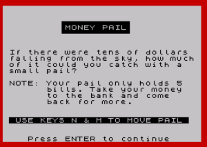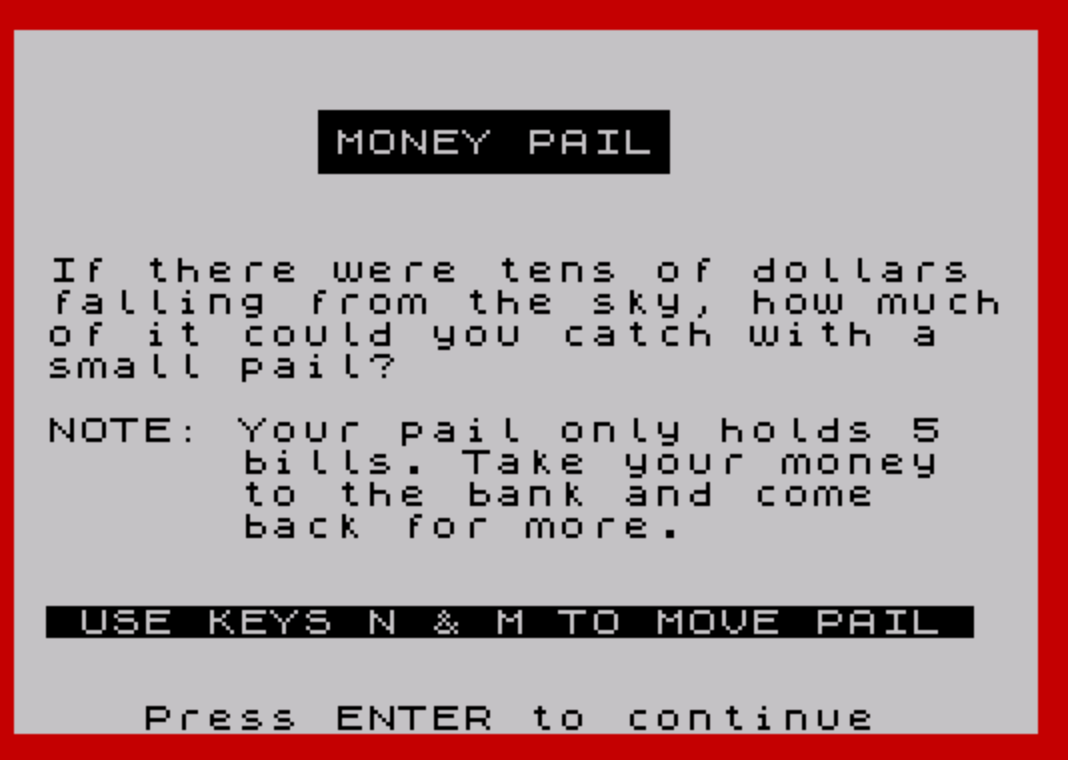4030 PRINT AT 7,1;"If there were tens of dollars falling from the sky, how much of it could you catch with a small pail?";AT 12,1;"NOTE: Your pail only holds 5 bills. Take your money to the bank and come back for more.";AT 18,1;" USE KEYS N & M TO MOVE PAIL "