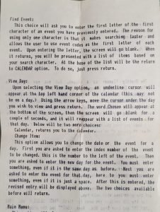 AT L-2,0andAT L+2,0before drawing atAT L,0, meaning the previous cursor position is only erased if it is exactly two rows away; rapid key presses could leave ghost characters. GOSUB 25at line 501 re-dimensions all arrays, which resets appointment data. This is intentional for setting up a new month, but any previously entered appointments are silently discarded.