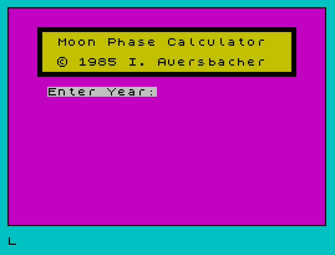 1150 PRINT PAPER 6;AT 2,3;"\:'\''\''\''\''\''\''\''\''\''\''\''\''\''\''\''\''\''\''\''\''\''\''\''\''\':";AT 3,3;"\: Moon Phase Calculator \ :";AT 4,3;"\: \ :";AT 5,3;"\: \* 1985 I. Auersbacher \ :";AT 6,3;"\:.\..\..\..\..\..\..\..\..\..\..\..\..\..\..\..\..\..\..\..\..\..\..\..\..\.:"