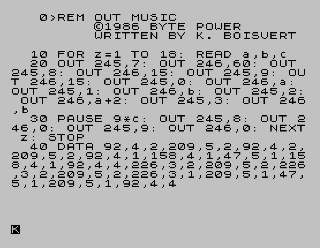 0 REM OUT MUSIC ©1986 BYTE POWER WRITTEN BY K. BOISVERT