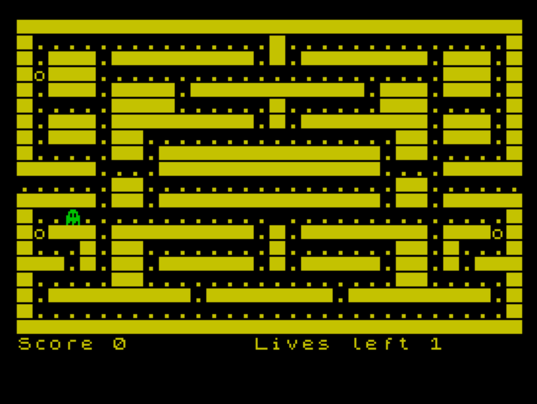 140usesSCREEN$ (v,h)=""to detect the player walking into the ghost; this works because the ghost was just printed atz,xusing UDG\i, and the player moves into empty space — the condition is fragile but functional given the fixed draw order. - The session high score (
