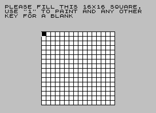 280 CLS : PRINT "PLEASE FILL THIS 16X16 SQUARE. USE ""1"" TO PAINT AND ANY OTHER KEY FOR A BLANK"