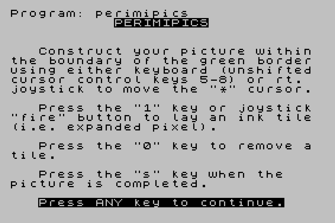 Perimipics is a drawing program that lets the user move a cursor around a bordered canvas using keyboard keys 5–8 or a joystick, placing or removing filled block-graphic tiles to compose a picture. When the drawing is complete, the program converts the 22×24-cell canvas into nine user-defined graphics (UDGs A through I), each storing a portion of the image as POKEd character data at addresses 65368–65416. A companion subroutine at line 9987 reassembles and displays the nine UDGs as a tiled image on screen, and the instructions explain how to preserve or merge the UDG data with other programs using NEW, DELETE, or MERGE commands.