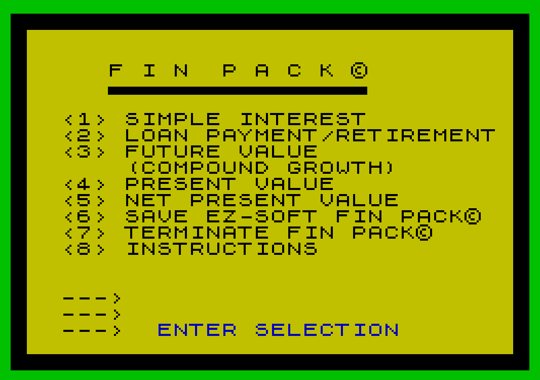 8928 LET LOC=0: PRINT AT 3,6;"F I N P A C K \*": PRINT AT 4,6;"\..\..\..\..\..\..\..\..\..\..\..\..\..\..\..\..": LET TEST=0: PRINT AT 6,3;"<1> SIMPLE INTEREST": PRINT AT 7,3;"<2> LOAN PAYMENT/RETIREMENT": PRINT AT 8,3;"<3> FUTURE VALUE": PRINT AT 9,3;" (COMPOUND GROWTH)": PRINT AT 10,3;"<4> PRESENT VALUE": PRINT AT 11,3;"<5> NET PRESENT VALUE": PRINT AT 12,3;"<6> SAVE EZ-SOFT FIN PACK\*": PRINT AT 13,3;"<7> TERMINATE FIN PACK\*": PRINT AT 14,3;"<8> INSTRUCTIONS"