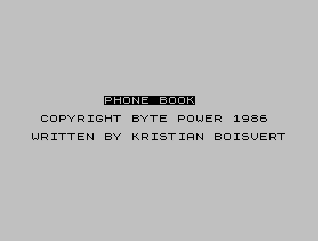 3 PRINT AT 9,10;"PHONE BOOK";AT 11,3;"COPYRIGHT BYTE POWER 1986";AT 13,2;"WRITTEN BY KRISTIAN BOISVERT"