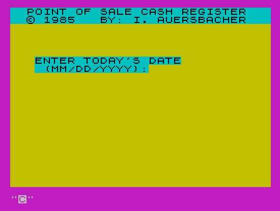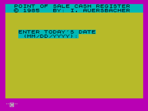 30 PRINT PAPER 5;" POINT OF SALE CASH REGISTER ";AT 1,0;" \* 1985 BY: I. AUERSBACHER ";AT 6,3;"ENTER TODAY'S DATE";AT 7,3;" (MM/DD/YYYY):"