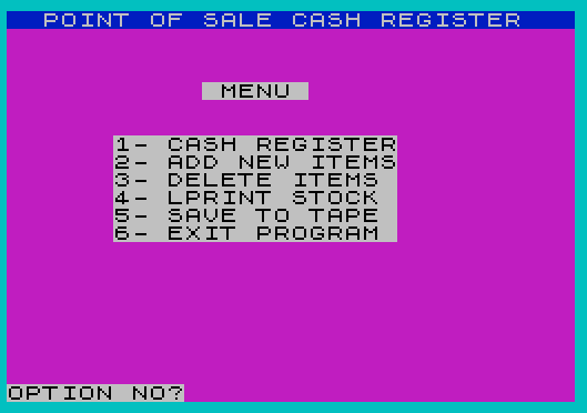 45 PRINT PAPER 7;AT 4,11;" MENU ";AT 7,6;"1- CASH REGISTER";AT 8,6;"2- ADD NEW ITEMS";AT 9,6;"3- DELETE ITEMS ";AT 10,6;"4- LPRINT STOCK ";AT 11,6;"5- SAVE TO TAPE ";AT 12,6;"6- EXIT PROGRAM ";AT 21,0;"OPTION NO?"