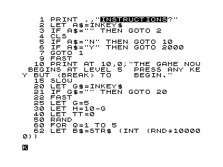 \n2030 PRINT ,," THIS IS A GAME TO TEST YOUR MENTAL AND PHYSICAL REFLEXES. ",,," IT WILL START AT THE MEDIUM DIFFICULTY LEVEL."