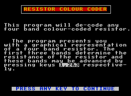 6040 PRINT AT 5,0;"This program will de-code any four band colour-coded resistor.": PRINT ''" The program presents youwith a graphical representation of a four band resistor. Thefirst three bands determine the resistance of the resistor andthese bands may be advanced by pressing keys 1,2&3 respective-ly."