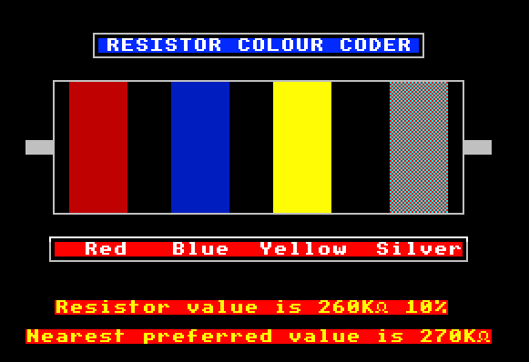 5020 PRINT PAPER 1; INK 7;AT 1,5;"RESISTOR COLOUR CODER"