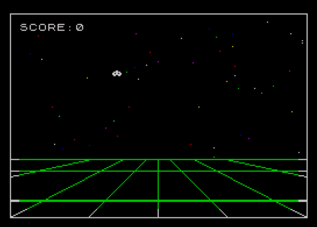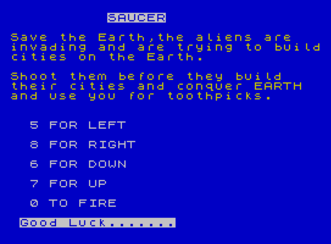 \p(the saucer sprite). - Lines 4000–4050: Title/instructions screen — sets colors, prints the story and key assignments, waits for a keypress, then draws a starfield before jumping to line 5 to start play.