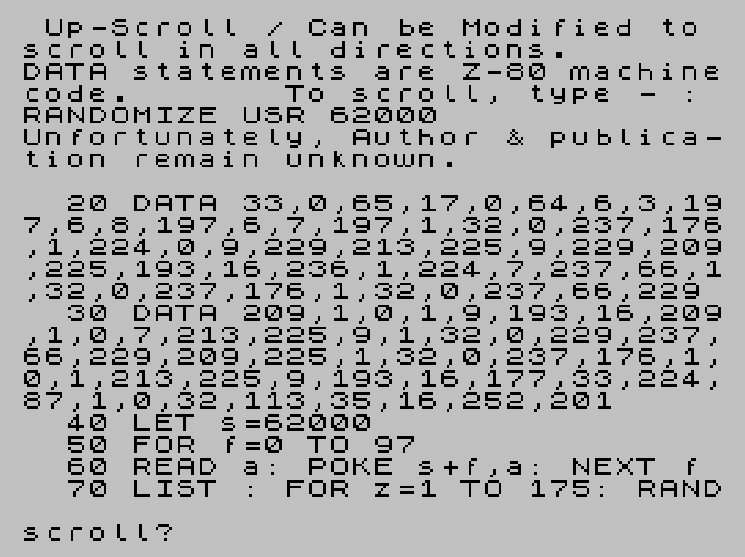 10 REM Up-Scroll / Can be Modified to scroll in all directions. DATA statements are Z-80 machinecode. To scroll, type - : RANDOMIZE USR 62000 Unfortunately, Author & publica-tion remain unknown.