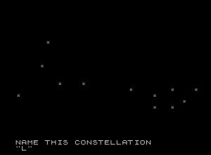 8120 CLS : PRINT '"This program displays a","constellation selected at randomand asks for it's name."''"You have 2 tries before the correct name is revealed to you."