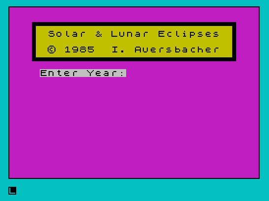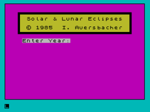 1150 PRINT PAPER 6;AT 2,3;"\:'\''\''\''\''\''\''\''\''\''\''\''\''\''\''\''\''\''\''\''\''\''\''\''\''\':";AT 3,3;"\: Solar & Lunar Eclipses \ :";AT 4,3;"\: \ :";AT 5,3;"\: \* 1985 I. Auersbacher \ :";AT 6,3;"\:.\..\..\..\..\..\..\..\..\..\..\..\..\..\..\..\..\..\..\..\..\..\..\..\..\.:"