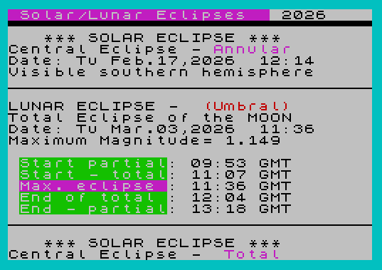 This program calculates and displays solar and lunar eclipses for any year between 1000 and 4000, using Jean Meeus’s astronomical algorithms. It computes Julian Day Numbers and applies trigonometric correction terms to determine the eclipse magnitude, type (total, annular, annular/total, or partial for solar; umbral, penumbral, or partial for lunar), and geographic visibility zone. For lunar eclipses, subroutine 600 further calculates the precise GMT times of partial and total phase start and end. Output can be directed to either the screen (stream 4 opened to “s”) or a printer (stream 4 opened to “p”), and two UDG characters are defined via POKEs and DATA at line 2000 for the title screen decoration.