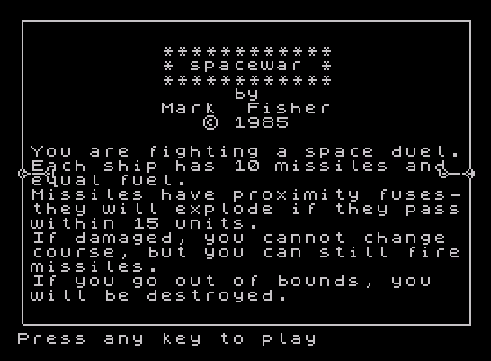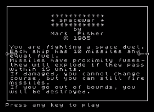 8520 PRINT AT 5,15;"by"," Mark Fisher"," \* 1985"''" You are fighting a space duel. Each ship has 10 missiles and equal fuel."