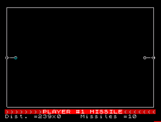 2020 PRINT #1;AT 0,0;">>>>>>>>PLAYER #";a;" MISSILE<<<<<<<Dist. =";FN v(a,1,4);"x";FN v(a,1,5),"Missiles =";FN v(a,1,2);" "