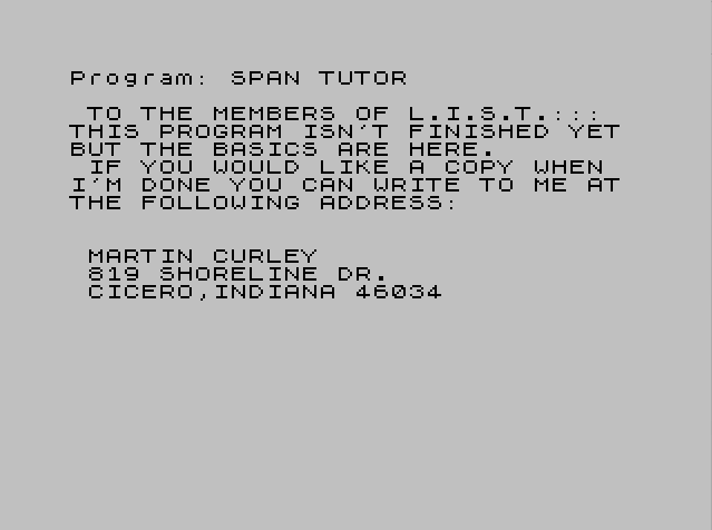 1 INK 0: PRINT ,," TO THE MEMBERS OF L.I.S.T.:::","THIS PROGRAM ISN'T FINISHED YET","BUT THE BASICS ARE HERE."