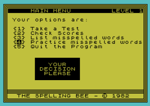 820 PRINT AT 7,bu;"{3} List misspelled words";AT 8,bu;"{4} Practice misspelled words"