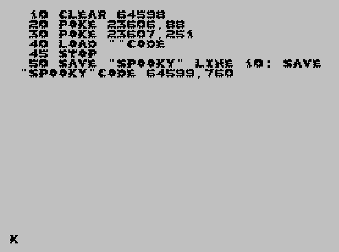 50 SAVE "SPOOKY" LINE 10: SAVE "SPOOKY"CODE 64599,760