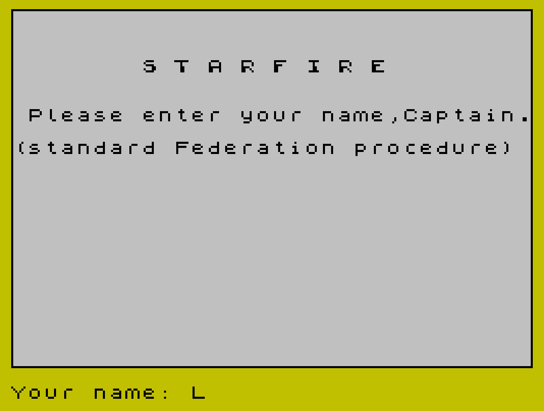 9242 POKE 23607,60: PRINT ''" Please enter your name,Captain."''"(standard Federation procedure)": LET ink=0: GO SUB 7900