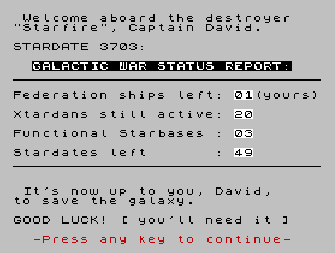 9310 PRINT '"Federation ships left: "; BRIGHT 1;"01"; BRIGHT 0;"(yours)"
