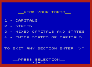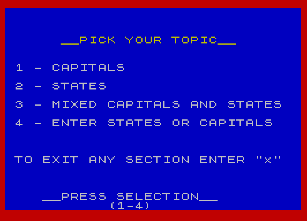 8006 PRINT AT VAL "10",VAL "0";"the state and it's capital.": PRINT AT VAL "12",VAL "0";" To exit this section enter ""x"""