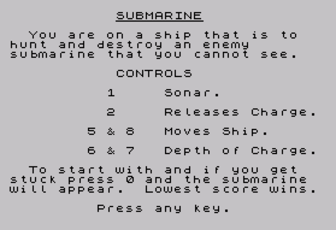 1040 PRINT AT 16,0;" To start with and if you get"'"stuck press 0 and the submarine"'"will appear. Lowest score wins."