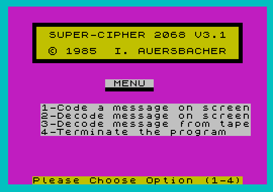 220 PRINT PAPER 7;AT 9,12;" MENU "; PAPER 3;AT 10,12;"\''\''\''\''\''\''"; PAPER 7;AT 12,4;"1-Code a message on screen";AT 13,4;"2-Decode message on screen";AT 14,4;"3-Decode message from tape";AT 15,4;"4-Terminate the program "; PAPER 6;AT 21,3;"Please Choose Option (1-4)"