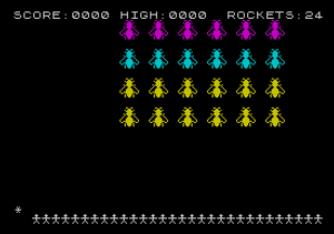 This program is a single-screen shoot-the-swarm game in which the player uses a joystick to aim a crosshair and fire rockets at a grid of giant mutant bees attacking a city. Up to 16 custom User-Defined Graphics (UDGs) are defined via DATA statements and POKE USR at startup to render the bees, rocket exhaust frames, and city silhouette. The SOUND keyword is used at line 75 to initialize a multi-channel audio chip with register values for background atmosphere. Game logic is driven by a state machine encoded in the variable `c`, with GO TO targets computed as `1080+c*100` to dispatch rocket flight animation, bee destruction, and city-damage phases. Scoring penalizes the player five points per surviving bee and two points per civilian killed, with a persistent high score tracked across playthroughs.
