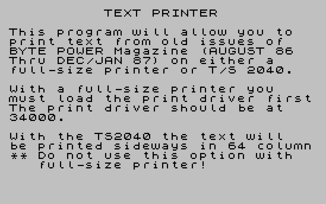 3020 PRINT AT 4,0;"This program will allow you to print text from old issues of BYTE POWER Magazine (AUGUST 86 Thru DEC/JAN 87) on either a full-size printer or T/S 2040."