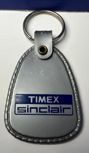 This silver saddle key tag is printed with a stacked version of the Timex/Sinclair logo.