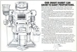 Smart Rabbit Robot (Hobby Robot Co.) was marketed as “plug compatible with the Timex/Sinclair” series, priced at $329.95. Available in two kit levels, it could be controlled via a TS/1000 computer either mounted on the robot or connected remotely. The Level 2 kit included servo-controlled arms, grippers, and head, with all servomotors proportionally controlled via the computer bus.