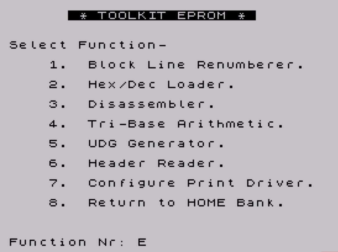 10 CLS :POKE (PEEK 23740+256*PEEK 23741+1),2:PRINT TAB 6;INVERSE 1;" * TOOLKIT EPROM * "'''INVERSE 0;"Select Function-"''TAB 4;"1. Block Line Renumberer."''TAB 4;"2. Hex/Dec Loader."''TAB 4;"3. Disassembler."''TAB 4;"4. Tri-Base Arithmetic."''TAB 4;"5. UDG Generator."''TAB 4;"6. Header Reader."''TAB 4;"7. Configure Print Driver."''TAB 4;"8. Return to HOME Bank.":INPUT "Function Nr: ";q:GO TO 100*q+(100 AND q>3)