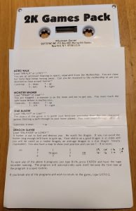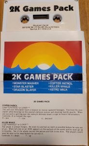 This cassette pack contains six independent BASIC games, each saved under its own name. All are engineered to fit within the 2K RAM limit of an unexpanded machine. The games are: AWALK, CPATROL, DRAGON, KWHALE, MMASH, and SBLAST.