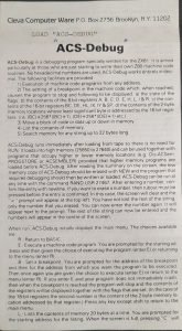 Machine code debug program. Provides register contents, memory search, block move, memory list, etc. Can be used with ACS Assembler...