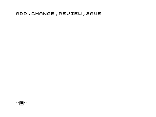 30 PRINT "ADD,CHANGE,REVIEW,SAVE"