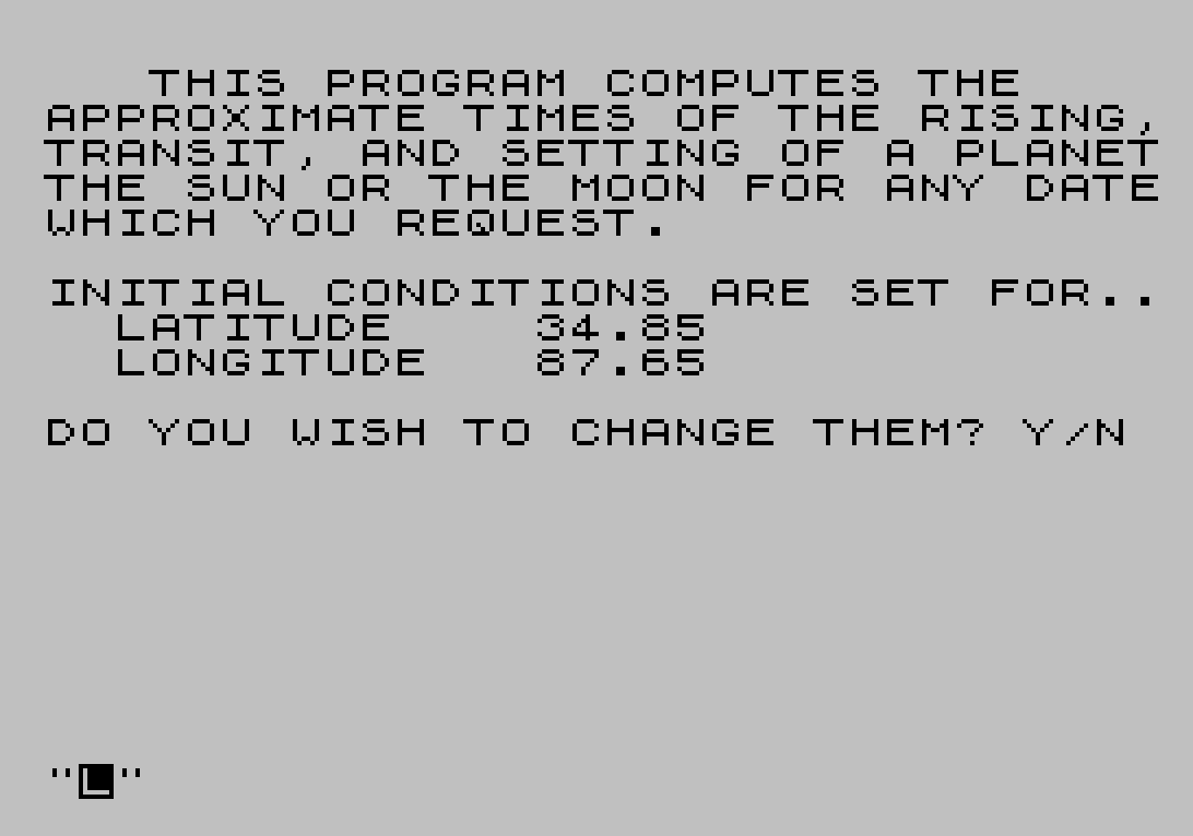This program computes the approximate rise, transit, and set times for the Sun, Moon, and all eight planets (Mercury through Pluto) for any user-specified date and geographic location. The user supplies a latitude and longitude (defaulting to approximately 34.85°N, 87.65°W) and selects one of ten bodies by number. Planetary orbital elements are packed as fixed-width seven-character fields into string variables and parsed with VAL and substring slicing at line 1970, allowing nine orbital parameters per body to be loaded into the 9×9 array P without a DATA statement. Sidereal time is computed at lines 3280–3400, and rise/set hour angles are derived via the ACS function using the tangent product of latitude and declination. The Moon uses a separate simplified positional algorithm (lines 2670–2860) based on mean longitude, perigee, and ecliptic anomaly rather than the general planetary routine.