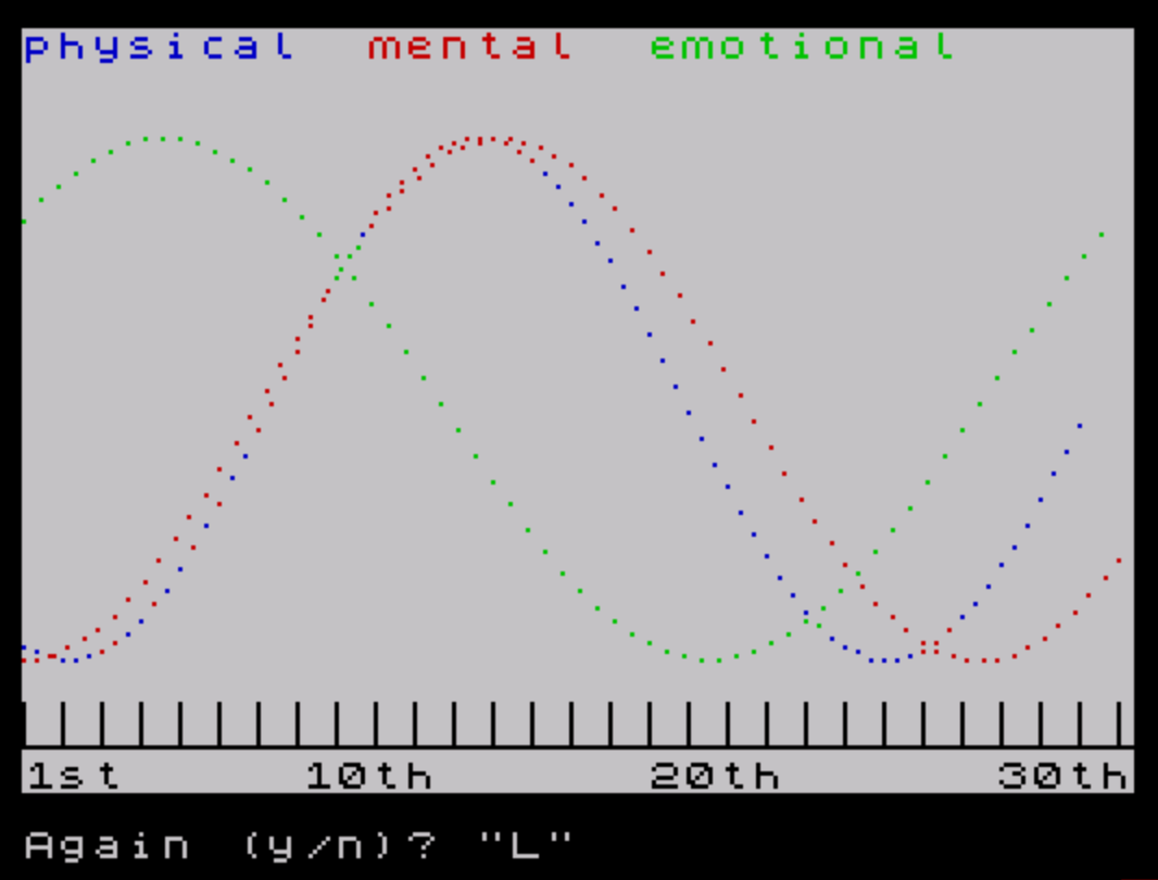 This program calculates and plots biorhythm cycles — physical (23-day), mental (28-day), and emotional (33-day) — as sine waves on a graphics display. The user enters their date of birth and today’s date; the program computes the number of elapsed days using a simplified Julian-style formula (365.25 days per year, 30.35 days per month). Each cycle is drawn using PLOT with INK color-coding: INK 1 (blue) for physical, INK 2 (red) for mental, and INK 4 (green) for emotional. The horizontal scale is adjusted per cycle using the expression `(35-28+u)` so that each wave spans the same screen width regardless of its period. A tick-mark axis is drawn at y=10 with vertical markers at intervals of B (which is uninitialized, defaulting to 0, making every column a tick — a likely bug).