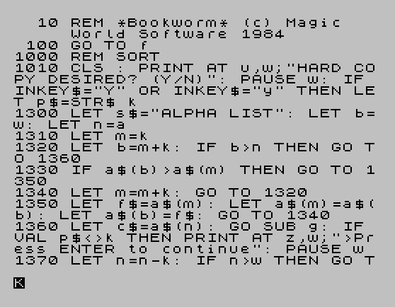 LET c$(70 TO )=d$with no upper bound specified for the slice, which relies on the interpreter accepting an open-ended upper slice to fill to end of string. This is valid BASIC but the same construct is used in the Change routine at line 3290 and in the display at line 9050. - The sort outputs each record as it is placed (via