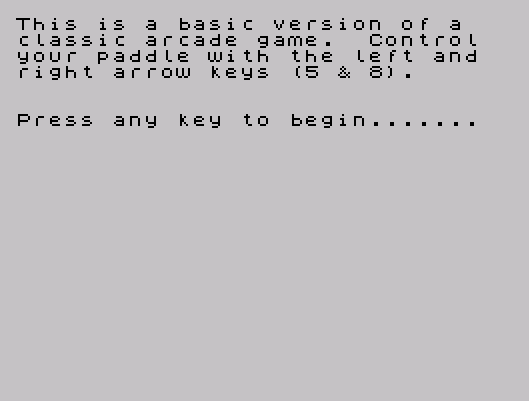 11 PRINT "This is a basic version of a classic arcade game. Control your paddle with the left and right arrow keys (5 & 8)."