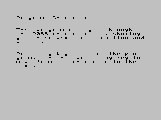 2 PRINT : PRINT : PRINT "Press any key to start the pro- gram, and then press any key to move from one character to the next."