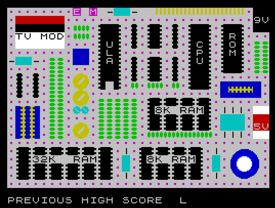 USR 51470— screen/display refresh (called asc1=USR 51470orl=USR 51470)USR 39694— joystick read, returns direction code stored iniUSR 39840— keyboard handler (called whenINKEY$<>"")USR 40363— collision/pickup sound effectUSR 40381— component connection sound/score updateUSR 40420— timer encoding helper (packstoreinto a 16-bit POKE pair first)USR 44490,USR 44520— level-transition effectsUSR 58420— transition to circuit-board sub-game