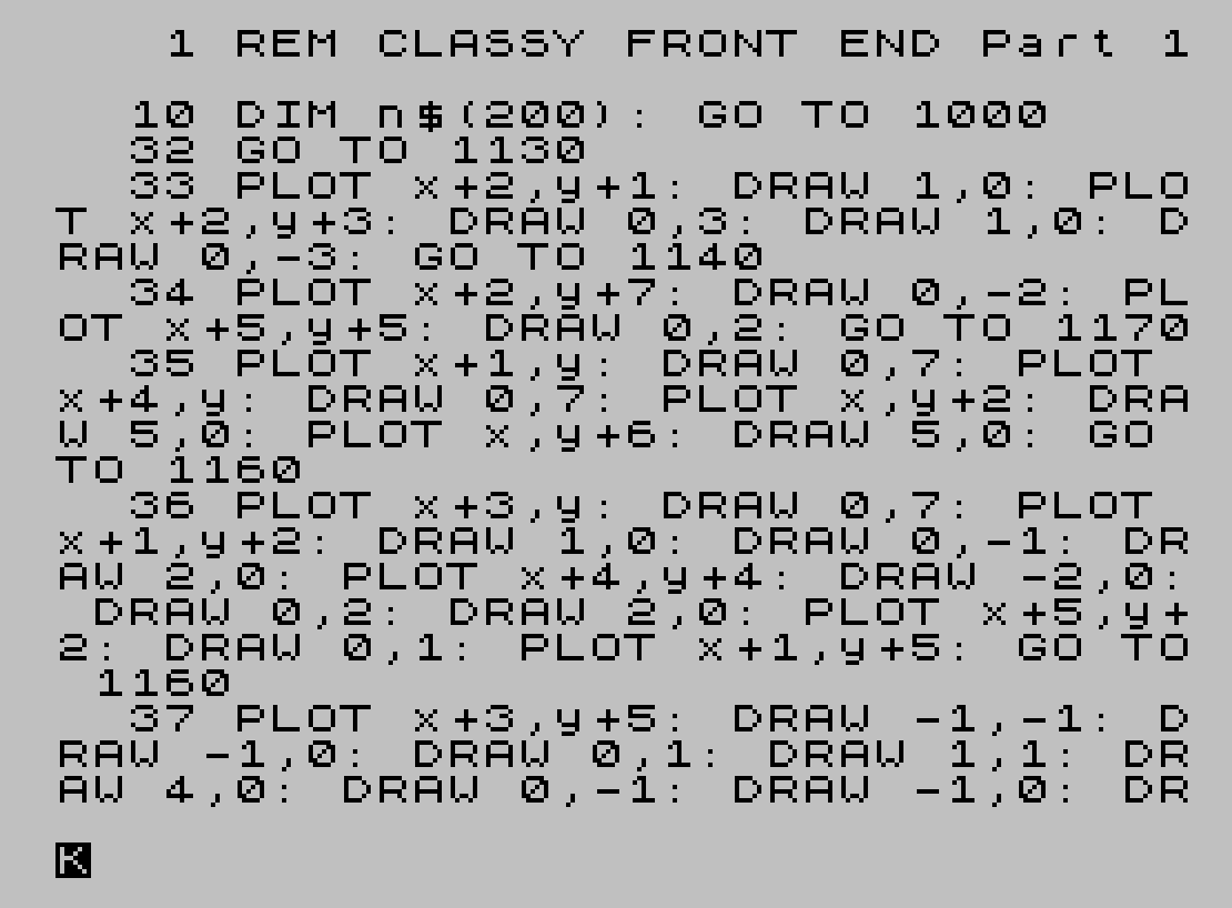 86 PLOT x+1,y+5: DRAW 0,1: DRAW 1,0: DRAW 0,-3: DRAW 1,0: DRAW 0,1: DRAW 0,-3: DRAW 1,0: DRAW 0,1: PLOT x+5,y+3: DRAW 0,1: PLOT x+6,y+5: DRAW 0,1: GO TO 1160