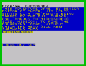 3 PRINT "THIS ADVENTURE GAME BY SENIOR EDITOR OF ENTER, JIM LEWIS, STARTS WITH THE HERO'S BEING ZAPPED BY THE EVIL CURSOR, AND SHRUNK TO MICROSCOPIC SIZE. MISSION: TO FIND THE ENLARGING BEAM, WITHOUT WHICH THE HERO WILL KEEP SHRINKING INTO NOTHINGNESS!"